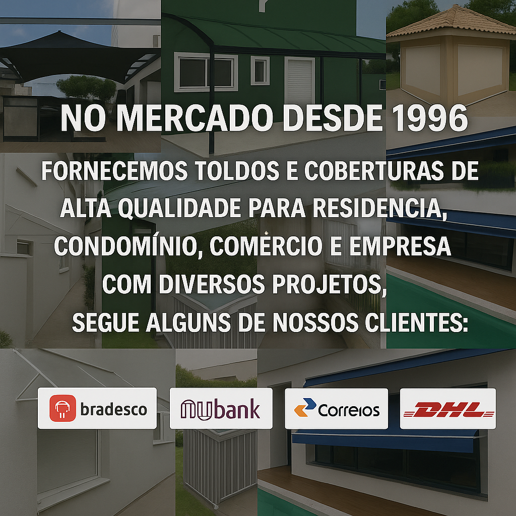 Fazemos qualquer tipo de toldo ou cobertura — motorizado ou manual, toldo articulado, envidraçamento de sacada, fechamentos e projetos personalizados.